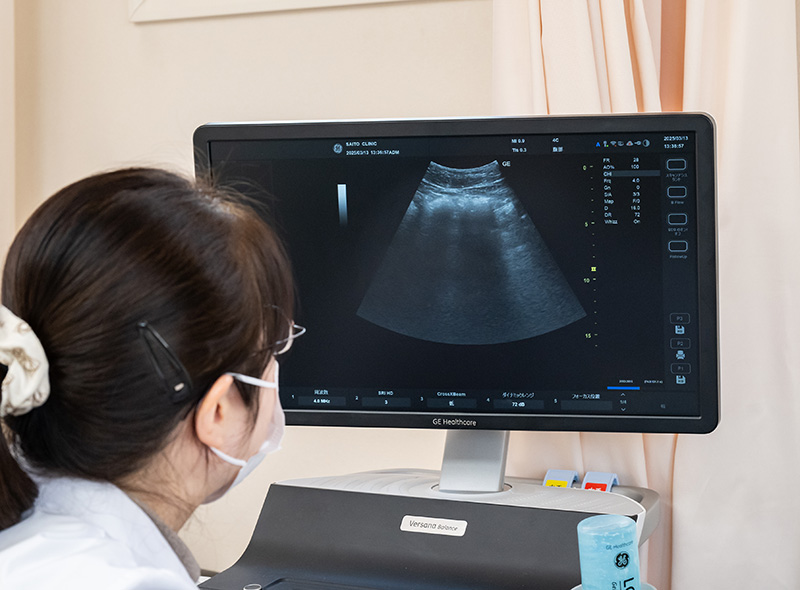 超音波検査のメリットは、患者様に痛みや苦痛を与えないことです。リアルタイムに体の中の状態を把握できるため、検査時と現在の病状に差異も生じません。